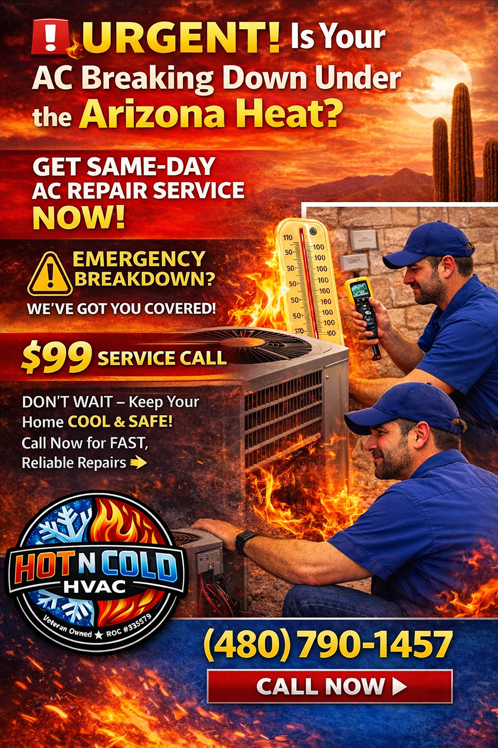 24/7 emergency HVAC service available when you need it most. Call Hot N Cold HVAC anytime for urgent heating or cooling repairs in Phoenix and surrounding areas.